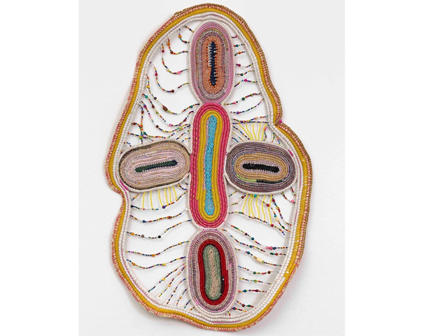 Caption: Paula do Prado, El Grito, 2018, cotton, wool, hemp, linen, raffia, bobbin cotton rope, twine, paper covered wire, wire, glass seed beads, wooden beads, açai seed beads. 110 x 60 x 5cm. Photo by Document Photography