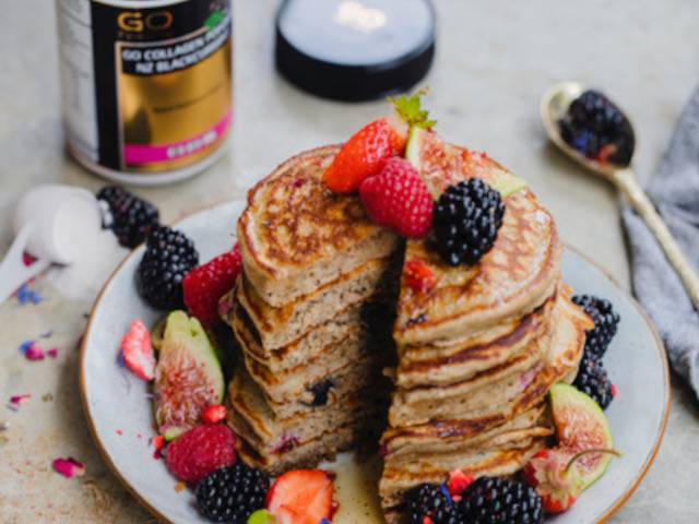 2 scoops GO Healthy GO Collagen Powder NZ Blackcurrant 1/2 ripe banana, mashed 2 eggs 1/3 cup milk kefir OR runny yoghurt 1 tps vanilla 1tbsp maple syrup 1/2 cup milk of choice 1/2 cup rolled oats 1 cup whole spelt flour 1ts chia seeds 1.2 tsp bicarb soda Pinch of salt 1/2 cup frozen berries