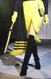 Never one to disappoint, Julien McDonald's latest collection is wall-to-wall chic, featuring fur scarves and sassy satin dresses, finished off with a sexy pair of wrist-length leathers. High waisted leather pencil skirts in creamy browns and patterned purples and blacks are combined with knitted sweaters, satin vests and sultry leather gloves. Jasper Conran mixes chocolate leather and jet black waistcoats with full length fabric and leather hotties to create an African-influenced look that fuses ethnicity with modernity.