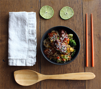 To serve: Place teriyaki chicken on a bed of fried rice.