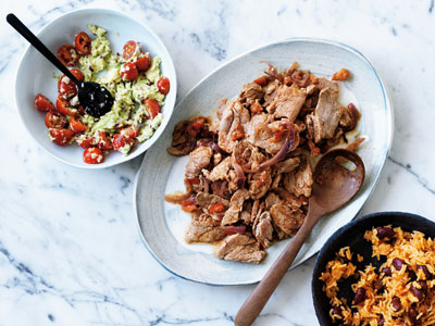 Divide the red rice and beans among 4 bowls, then top each bowl with one-quarter of the pork. Serve the guacamole salad, lime halves and coriander alongside.